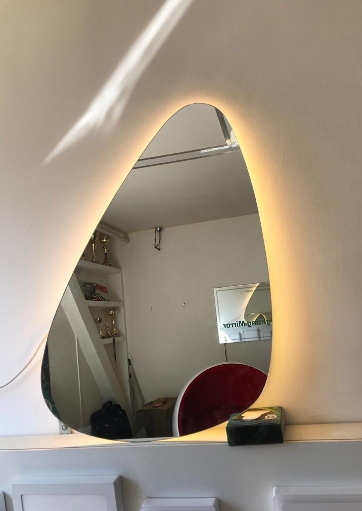 A tükröt a kívánalmaknak megfelelő alakra vágjuk, majd a formának megfelelő tartószerkezetbe építjük a világítást. Így a tükör és a tartószerkezet teljes vastagsága kb. 3-4 cm